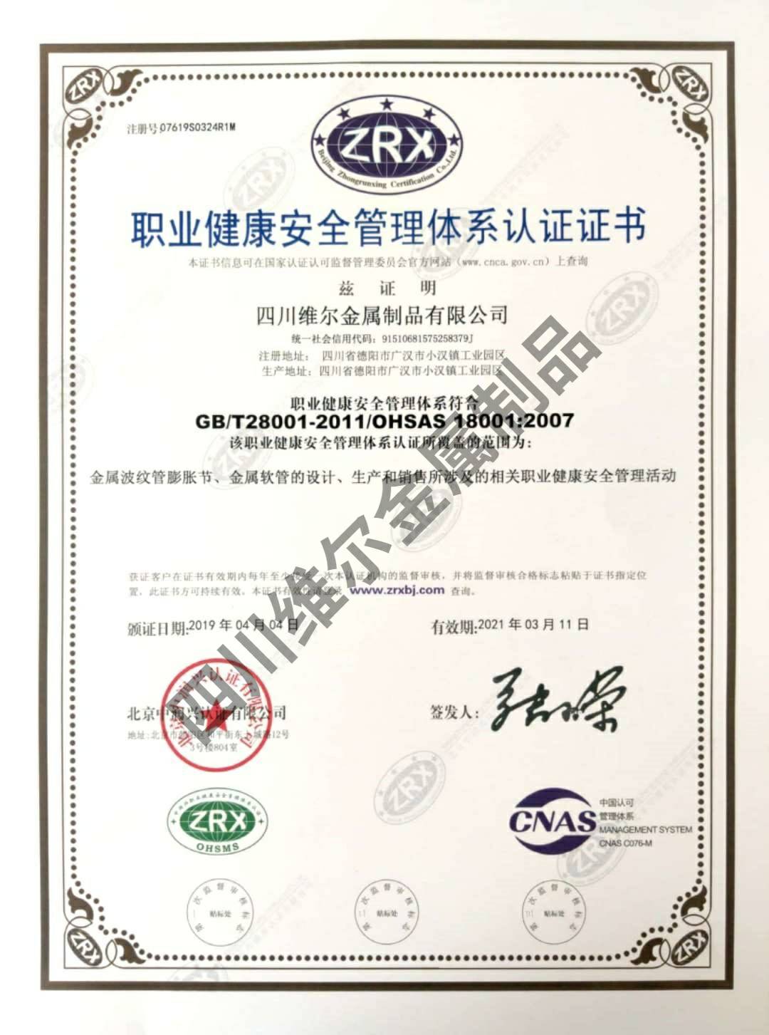 职业健康安全管理体系证书